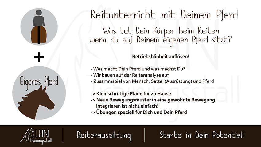 Voraussetzung für den Unterricht ist die Reiteranalyse, auf der wir aufbauen und auf Dein Reiten übertragen. Dies besprechen wir ganz individuell bei unserem Termin zur Reiteranalyse bei uns vor Ort, damit wir Dich und Dein Pferd optimal unterstützen können.